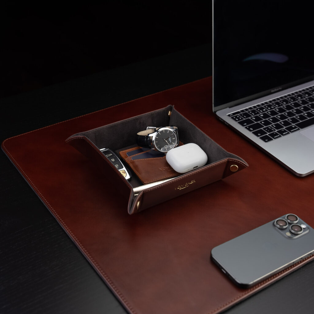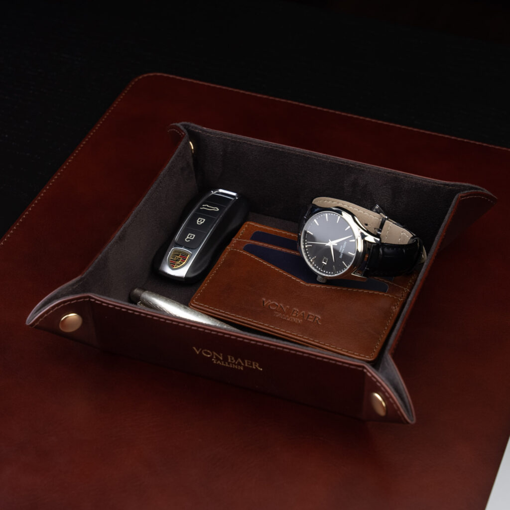 Saadaval soliidses pruunis, klassikalises helepruunis, elegantses mustas ja punases toonis. Kui soovite töötajatele ja äripartneritele täiuslikku ärikingitust, siis saate lisada nahast hoiukastile pressida initsiaalid.